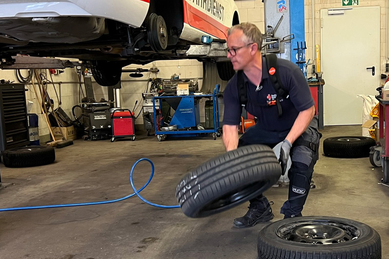 78 Sätze Sommerreifen mit Felgen liegen bereit und jedes Rad ist ca. 20 – 25 kg schwer. Insgesamt ca. 7 Tonnen gilt es nun für Siegfried Männer in den nächsten Tagen zu stemmen. Die Firma HUNIC GmbH aus Baiersbronn hat hierfür ein Exoskelett zu Testzwecken zur Verfügung gestellt. Das Exoskelett kann den Muskel-Skelett-Apparat bei Arbeiten mit starker körperlicher Belastung unterstützen.