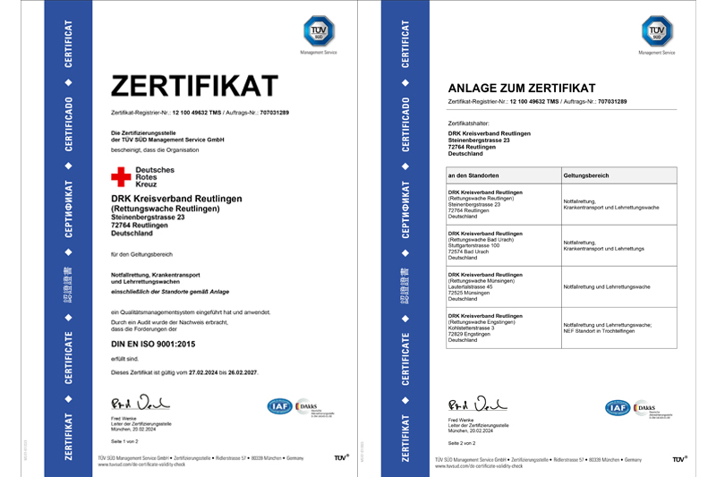 Das Qualitätsmanagement des Rettungsdienstes des DRK Kreisverbandes Reutlingen mit seinen fünf Standorten wurde in den Bereichen Notfallrettung, Krankentransport und Ausbildung erneut erfolgreich nach DIN ISO 9001 zertifiziert.